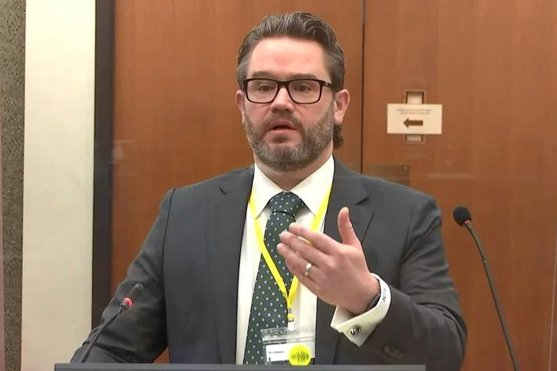FILE PHOTO: Defense attorney Eric Nelson questions a witness on the eighth day of the trial of former Minneapolis police officer Derek Chauvin for second-degree murder, third-degree murder and second-degree manslaughter in the death of George Floyd in Minneapolis, Minnesota, U.S. April 7, 2021 in a still image from video. Pool via REUTERS