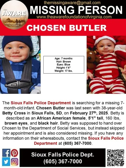 SIOUX FALLS, SD (KELO.com) — Sioux Falls Police are searching for a missing seven-month old infant. Chosen Butler was last seen with 38-year old Betty Cross of Sioux Falls. She was supposed to hand the child over to the Department of Social Services, but skipped that appointment. Police Information Officer Sam Clemens says the two haven’t been seen since last Friday.