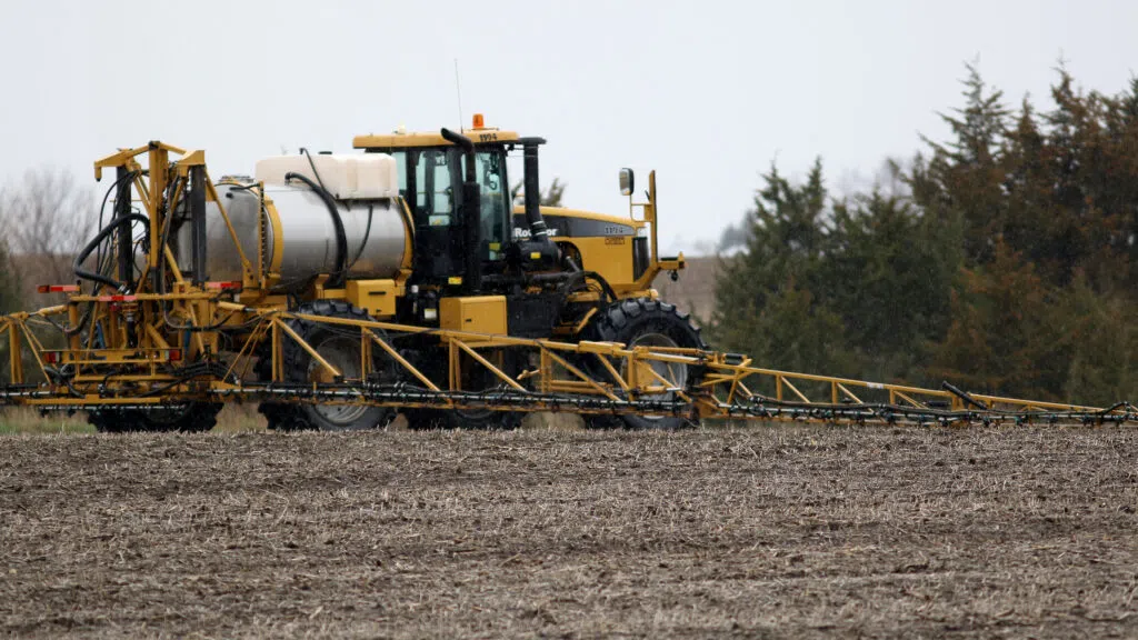 A sprayer sat idle in a western Iowa field on May 2, 2022 as rains continued to stall farmers. (Photo by Jared Strong/Iowa Capital Dispatch)