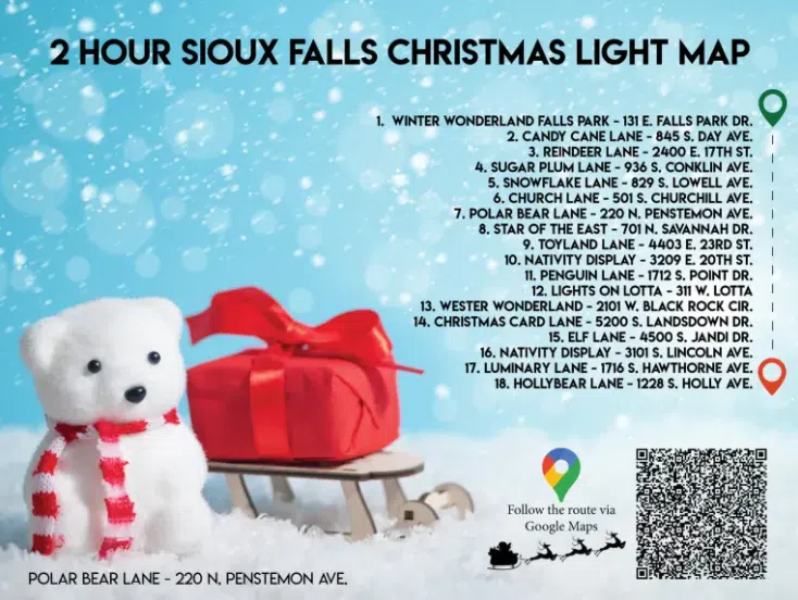 (Sioux Falls, SD) — The Sioux Falls Christmas Lights Map is now available and is free to the public. The map was created by a local and over 15-thousand people look at it. There’s 25 locations and it takes a few hours to visit them all.